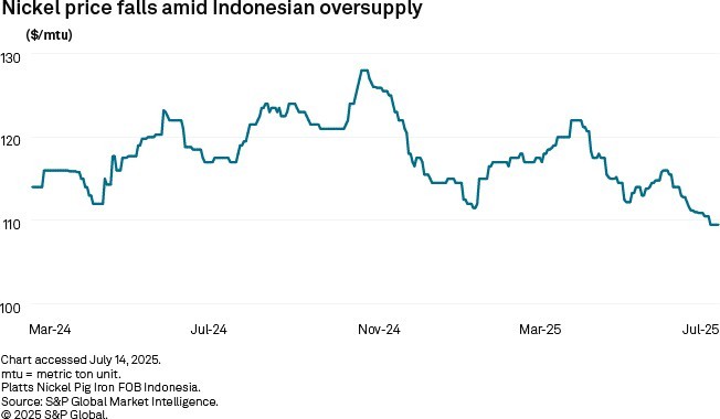 Prices have dipped due to the oversupply. Platts assessed nickel pig iron with 10% nickel content at $109.50 per metric ton unit (mtu) FOB Indonesia on July 14, down 14.5% from $128.00/mtu on Oct. 23, 2024, the highest since the assessment began in February 2024. The Indonesian government also decreased the annual nickel ore mining quota in early 2025, to 200 MMt from 240 MMt.