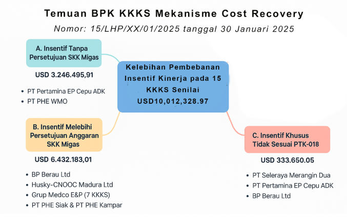 Namun, dalam audit BPK 5/LHP/XX/01/2025 yang terbit pada Januari 2025, untuk dapat dibebankan sebagai cost recovery, insentif yang diajukan oleh KKKS harus dianggarkan terlebih dahulu pada WP&B agar disepakati besar koefisien pengali upah dasar untuk penghitungan insentif. Atas dasar perhitungan tersebut, KKKS akan membayarkan insentif kinerja tahunan masing -masing tenaga kerjanya.